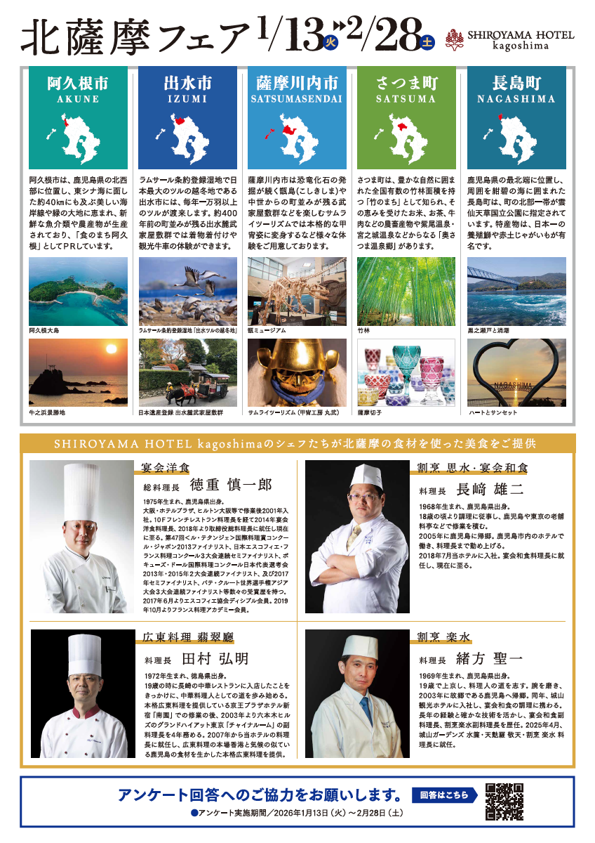 会場は城山ホテル鹿児島(鹿児島県鹿児島市新照院町)。期間中は、北薩摩地域である阿久根市・出水市・薩摩川内市・さつま町・長島町が誇る食材を使ったレストランフェア、特産品販売を行われます。