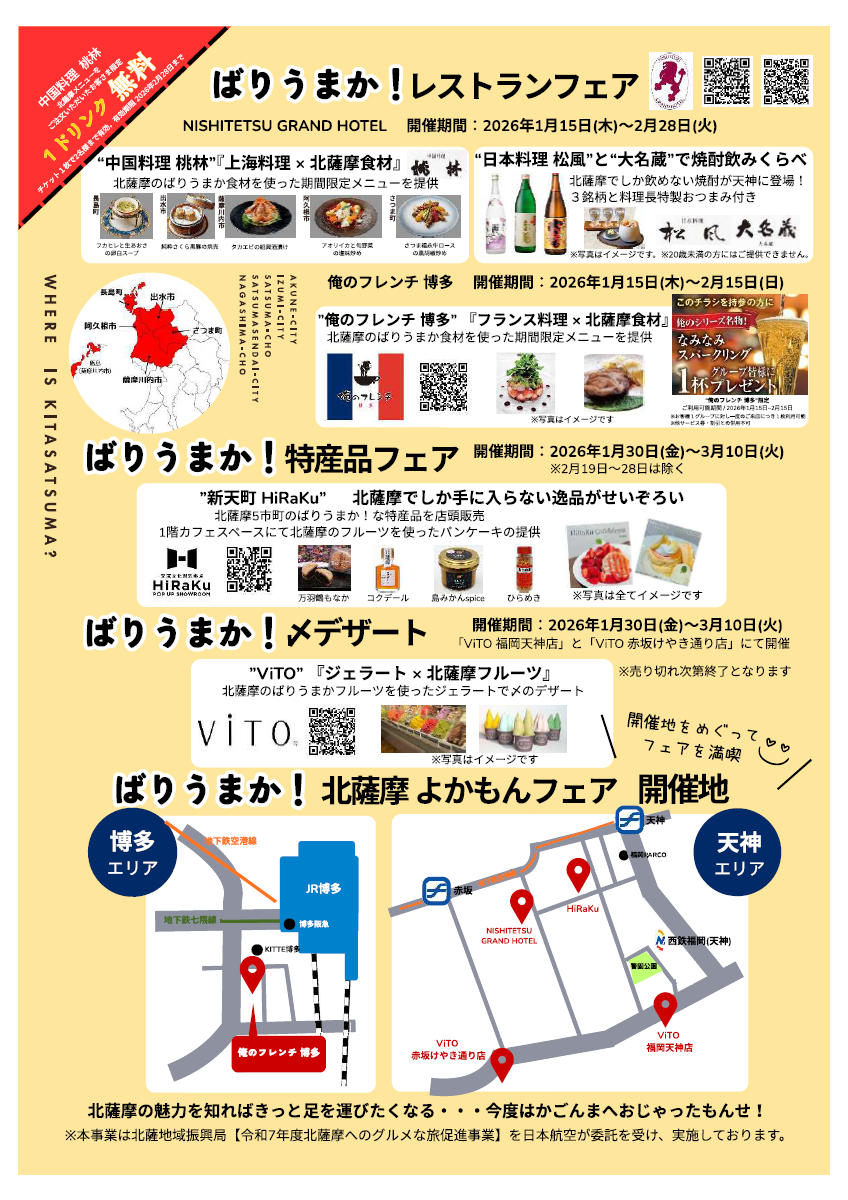北薩地域振興局では,北薩地域(阿久根市,出水市,薩摩川内市,さつま町,長島町)の知名度アップ及び誘客促進を図るため,福岡市において北薩地域の食材や特産品など多彩な魅力を発信する各種イベントを下記のとおり開催します。
